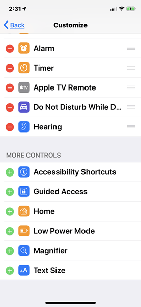 First, you want to add the “Hearing” shortcut to your iPhone’s Control Panel. Tap Settings > Control Center > Customize Controls, and scroll down to the More Controls section, then tap the green + sign for the “Hearing” entry. That adds an icon (looks like an ear) to your Control Center.