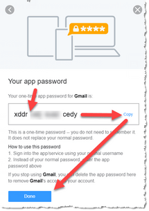 Please note that once you close that popup (by clicking the blue “Done” button at the bottom), you’ll never be able to see that password again. So you need click the blue “Copy” link to the right, and/or write down the password you see. Now you can close that popup window.