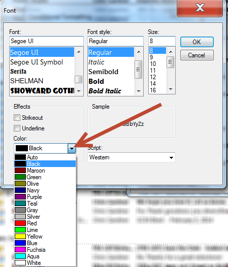 In that new window, click open the color list by clicking the right corner of the list (it’ll say “Black”). That expands to show you a list of colors, so just pick the one you want (like Red). Then click the OK button at the top right to close that window.