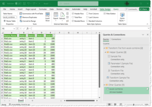 You’ll now see a formatted table in your blank workbook with an extra field at the beginning in the A column – this shows the name of the source file for that record. The data will start in column B and continue across for all the fields, and you’ll see all the records from all 12 .csv files in that one table. You can delete Column A if you don’t need to save the source file information, and you’ll have the 12 separate tables from the .csv files in one table, with some nice color formatting. If you don’t want that formatting, save the file as a .csv and close it, then re-open it and you’ll have the data just as it appears in those 12 .csv files but without formatting.