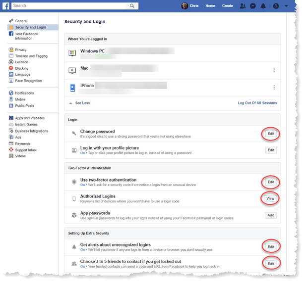 - Check where you’re logged in. If you see any devices or locations where you are that you don’t recognize, be sure to change your Facebook password. Log into Facebook on a computer, tablet or smartphone and navigate through the Security Settings to change your account password. Please make sure it’s a unique password, and not one that’s easily guessed. A long (over 12 characters) and random-character/number password is best.