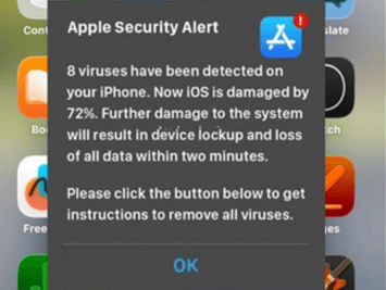 I had this Apple Security Alert pop up on my iPhone, and I’m not sure what to do. I clicked the Ok button, and another thing popped up that said my iPhone was damaged by 72%, and when I tapped the OK link, there appeared a new popup with a red button to call for support. What should I do?