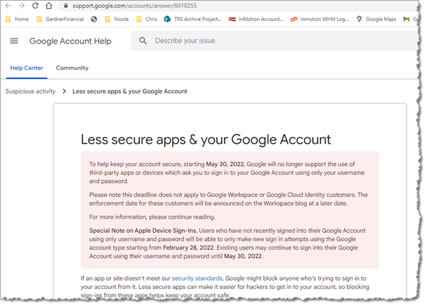 I received an email from Google the other day declaring: “On May 30, you may lose access to apps that are using less secure sign-in technology. Google will no longer support the use of third-party apps or devices…” I have been accessing both my AOL and Gmail accounts on my 2015 MacBook Pro and iPhone 6 using the Apple Mail apps (in a combined inbox). I also have a dormant Google Chrome app that I don’t use or need but acquired when someone had trouble with me using safari. I have many apps that I don’t use and probably should delete. I am concerned about the instructions asking me to delete my google app. I am unsure about how I access things. Could I have a support tutorial? I plan on replacing my iPhone 6 with a 13 this summer and I should resolve this before.