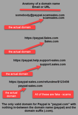 Here’s a bit about email addresses and website URLs: the domain name is usually near the front of an address, the part just after the @ symbol on an email address, and the part of a URL that ends with a domain suffix – .com, .net, .org, etc. (before any slash other than the initial two after https:). You may see addresses that show a domain somewhat similar to a legitimate one, such as paypal.scamsales.com. In this example, the part that just preceeds the domain suffix (.com) is the actual domain – scamsales.com. Having “paypal.” before that doesn’t mean the domain is from paypal, it simply means that scamsales.com setup a sub-domain called paypal. Also watch that the domain name hasn’t got a different character – paypal.com is not the same as paypal*.com, nor poypal.com, nor p*ypal.com, etc.