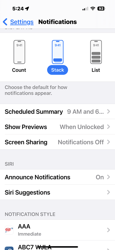 In the Settings>Notifications, the top section lets you set the display to be either a count, a stack or a list. Try out each one for a few days and see which you prefer. Scrolling down the controls, you can set Siri to announce notifications and allow Siri Suggestions (heavens NO!), and then choose the notification style for each of your installed apps. There’s no real shortcut except to turn off all notifications, otherwise you have to go down the list and enable or disable notifications for each app. I do each one individually – For each app, you choose to allow notifications or not, and then if you allow notifications, you can choose to have them beep you immediately or at the scheduled summary time, and choose which type of alerts you want for that app. Needless to say, for most apps I have notifications turned off so I’m not constantly barraged with beeps.