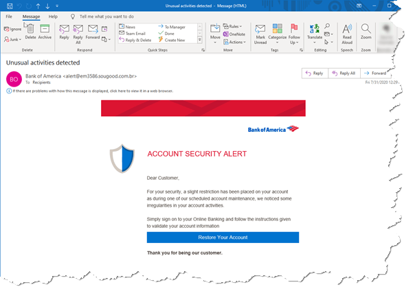 You can see that the link to “Restore your account” does not take you to a bankofamerica.com address but to an obfuscated address. If you went to that link you would not be going to B of A, but to a scammer’s website (that probably looks just like the B of A site).