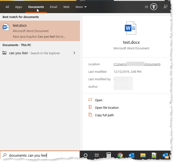 As you start typing, Windows will locate documents and other things that match what you type. At some point you should see the document you’re looking for. You may want to click the Documents item at the top of the search results so you narrow the search to just documents you’ve created with Microsoft Office. Alternatively, prefix your search terms with “documents:” so you’re not having to search the internet for matching items.
