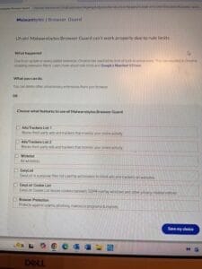 Following your recommendation, I installed the Malwarebytes Browser Guard awhile back on my Dell desktop PC, and just recently I have started getting this error window (picture attached) in Google Chrome. I don’t know how to deal with this. If I check all or some of the boxes, it tells me there is still a problem, and I’m not sure how to “delete otherwise unnecessary extensions” from my browser. Can you tell me what to do?