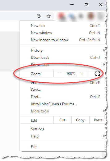 All major browsers have this zoom control capability. One note for Firefox users, the main browser settings list is a “hamburger” (3 horizontal lines) instead of 3 dots. It does the same thing, and you’ll see the zoom control on that list. The keyboard/mouse shortcut works regardless – it’s a feature of the operating system so works pretty much the same across all apps.