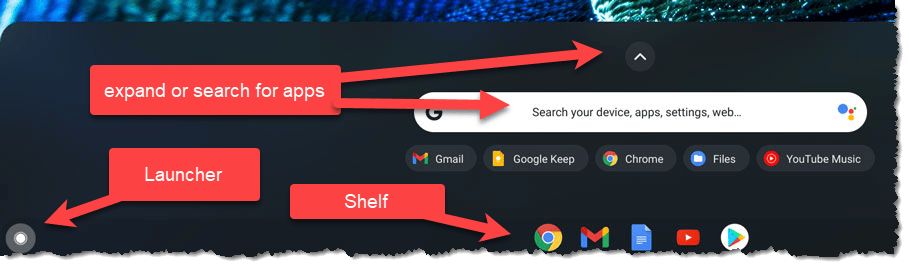 Your new Chromebook has a dock at the bottom just like Windows and Mac computers, where you can pin your most-used apps. Chromebook calls this the “shelf”. the circle icon at the left is called the Launcher, click that to see all your installed apps and search for anything (like “Settings”). Your Chromebook comes with a minimal set of icons already docked on the shelf, but you can add other installed apps. Chromebooks differ on how to do this: