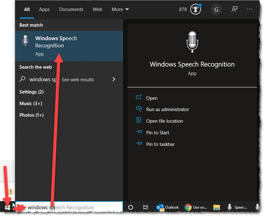 Next, you’ll run the Speech Recognition applet, which is located in your Start menu under Windows Ease of Access. Or you can just type “Speech Recognition” into the search bar to the right of the Start button (bottom-left of your screen), and click on the applet that appears in the search results.