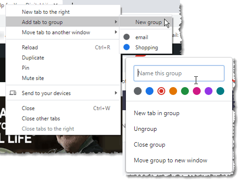 For awhile now, Google Chrome has had the feature of “tab grouping” available, as an alternative to bookmarks. What you can do is group your tabs by some sort of category. If you use multiple tabs for email, that can be a category. If you have multiple tabs open for online shopping, you can group them all in a shopping category, etc. Grouping your tabs is however you want to group them, and you can change the groupings, add or remote tabs from groups or move tabs to different groups, etc.