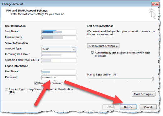 You should see a window that includes settings for the account, and you should be able to type in the new app password you created in the first part of the process. Type that into the password field and click the Next button, then complete the steps to finish and close all the windows you opened. Then start up Outlook. You should see Outlook connect to your verizon.net account and synchronize emails and folders with the AOL server.