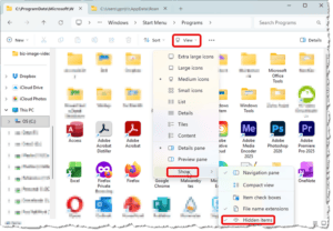 Certainly! For Windows 11 Home and Pro installations, the start menu items are in your file system. To see them, you’ll need to open the File Explorer app. Before you can view them, you need to make a change in the options for that app. Tap the menu item “View”, and hover over the last item “Show”, which reveals a sub-menu. On that sub-menu, click “Hidden items”.